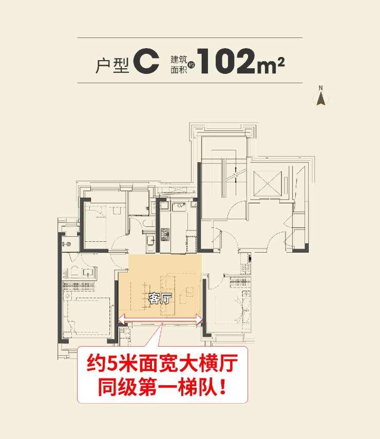 对比市面上多数同面积段只有3.3米左右的传统竖厅,约5米横厅带来的开阔视野、通透采光、家庭互动空间,是完全越级的享受。