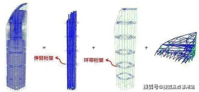 项目主体结构采用“巨型框架+核心筒+伸臂桁架+环带桁架”的结构体系。混凝土核芯筒平面基本呈六边形,由下至上合理收分。采用四道伸臂桁架,每道桁架高度约2m,沿塔楼高度结合避难层均匀分布,并在核芯筒的墙体内贯通设置钢框架,形成整体传力体系,优化结构效能。
