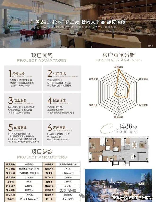 户型配置:建面约241-486㎡大平层,层高4.2米,配备全屋智能系统(摩根品牌)、劳芬卫浴、博世厨电等高端装标。