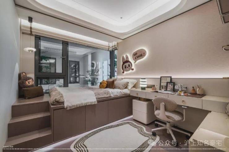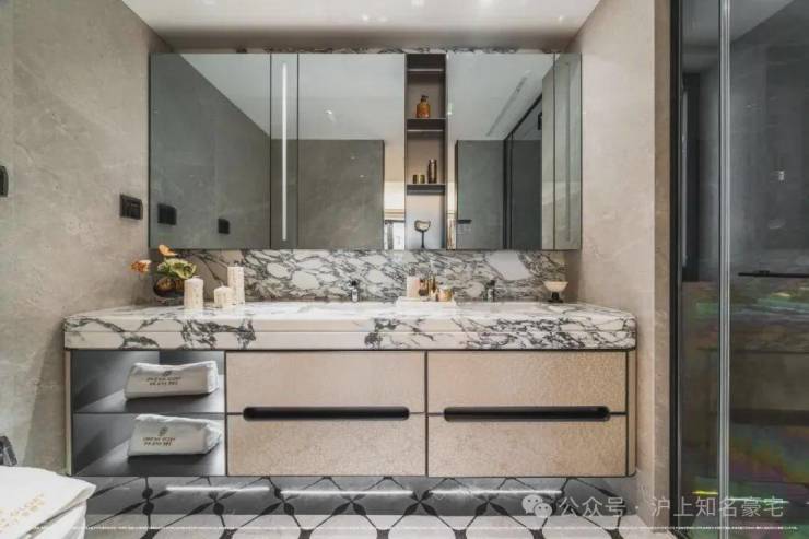 另外采用意大利 “大花白” 天然石材实现地墙满铺,双台盆与双镜柜的对称设计复刻五星酒店规制,美妆冰箱精准控温呵护护肤品,奢华至极!