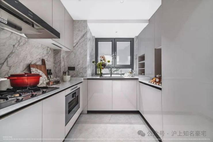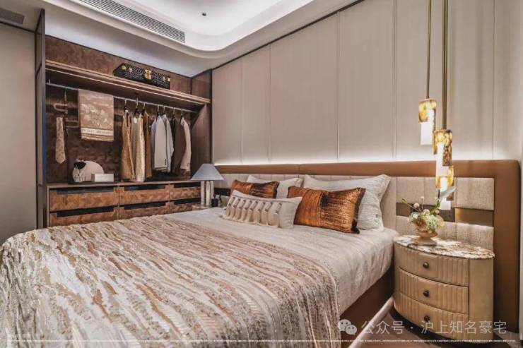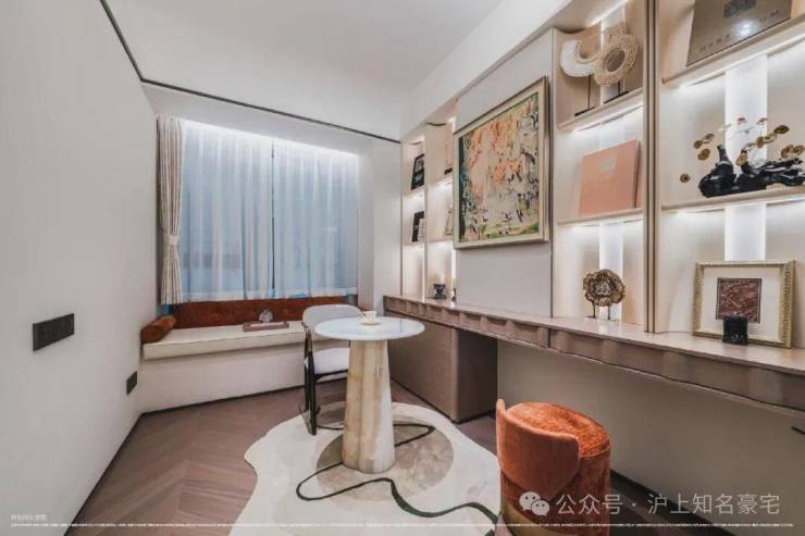 卧室则铺设海派鱼骨拼花地板,借木质肌理的温润与细腻,营造出私密领域的宁静氛围!这种“公区显质感、私域藏温度”的材质分区逻辑,恰是高端住宅设计中至关重要的一笔!