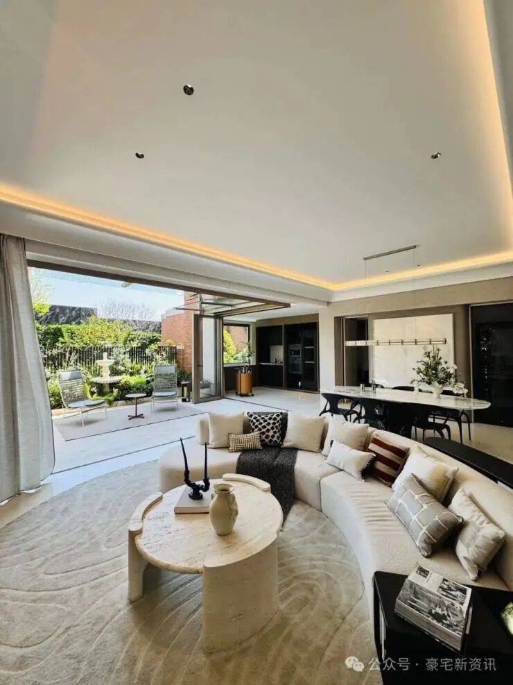 「无界空间」:客厅270度转角无柱设计,搭配落地玻璃,开阔视野将院中风景迎入日常。