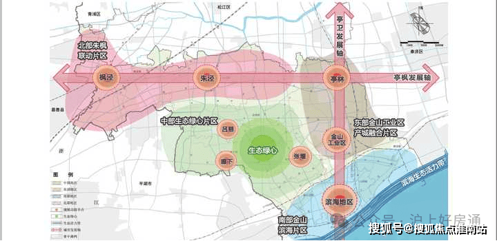亭卫发展轴:依托沈海高速和亭卫公路等主要交通廊道串联亭林镇、金山工业区和金山滨海地区,发展成为贯通区域东部地区的南北向经济发展轴。以产业功能为主,推动高新技术产业、战略性新兴产业快速发展。