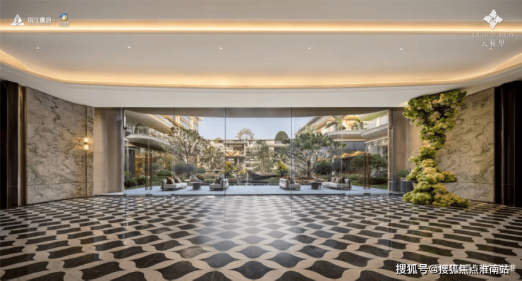 小区大门以“云扉初开”为灵感,打造具有仪式感的礼仪入口。宽约66米、高约8.6米的恢弘门庭,与酒店式归家大堂共同构筑,打造出极具仪式感的序厅,瞬间开启归家的尊崇心境。入口处精心打造的树阵水院,以静谧尊贵的氛围迎接归家。巧妙运用高差设计,通过层层递进的景观节点,优雅地引导业主步入社区深处。