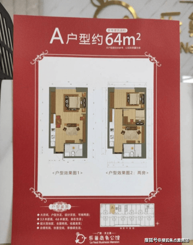 户型面积:主力户型为50-64㎡的一居室,毛坯交付,层高3.3米,单层19户(12户朝南、7户朝北)