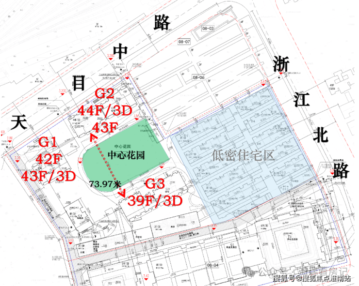 08-01地块设计了G1、G2、G3三栋超高层住宅,分别为39-44层不等,社区中建有中央景观。