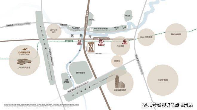 项目东至天山路31号、南至新渔东路、西至北虹路、北至天山路轨交变电站,近邻苏州河,距离地铁2号线北新泾站直线距离仅约300米。