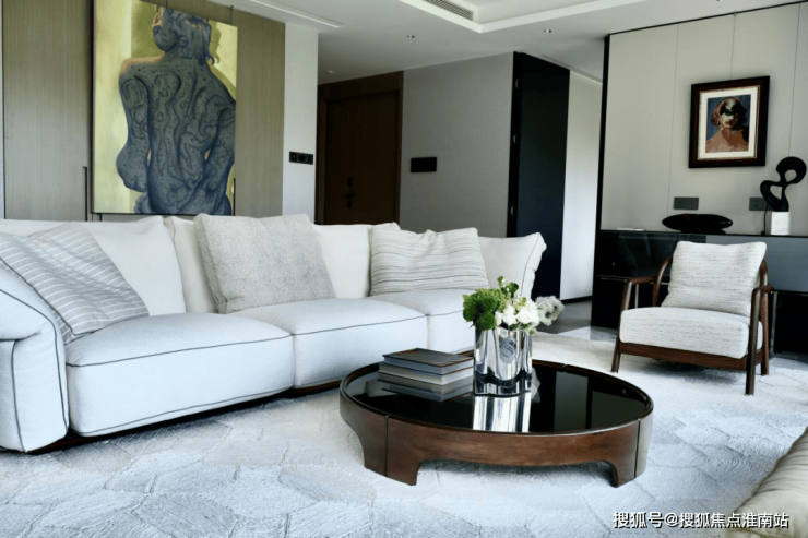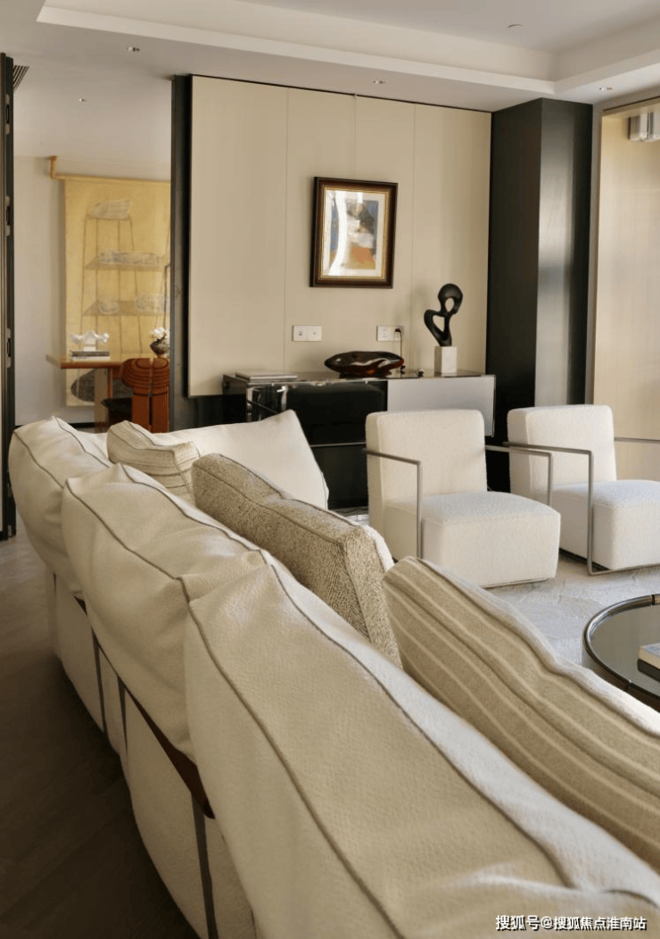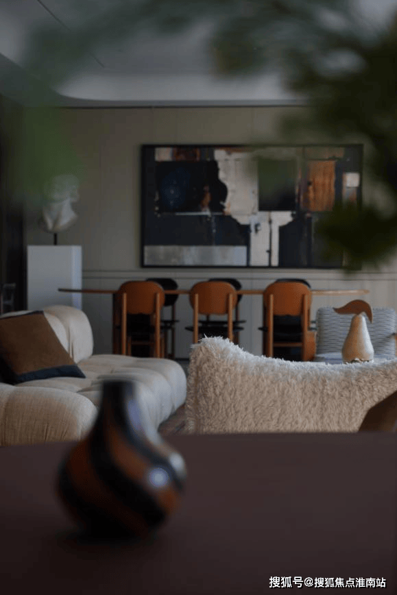 样板间的设计本身就是「静谧与光辉」的具象:约8.8米江景会客厅的窗前,黄浦江景如一幅流动画卷,成为展览最天然的“动态展品”;室内以米白、暖棕为主调,搭配原木纹理的家居艺术品,营造出「静谧」底色;而设计师精心布置的灯具,在夜晚与窗外霓虹、粼粼波光相呼应,形成「光辉」的对话。