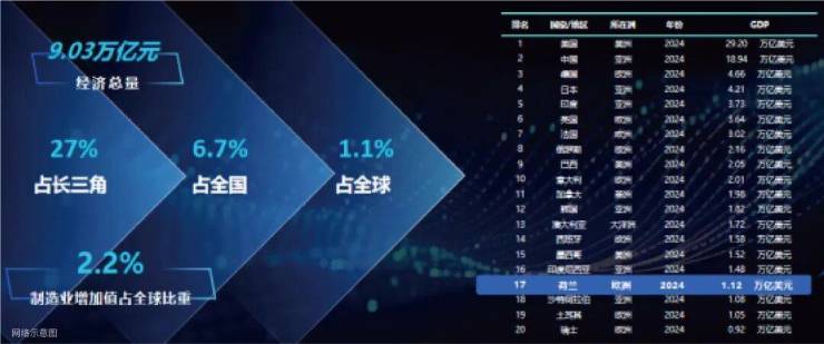 2024年,G60九城的GDP总量达到9万亿(1.27万亿美元),超过荷兰的经济总量,相当于全球各国经济总量排名的17位。
