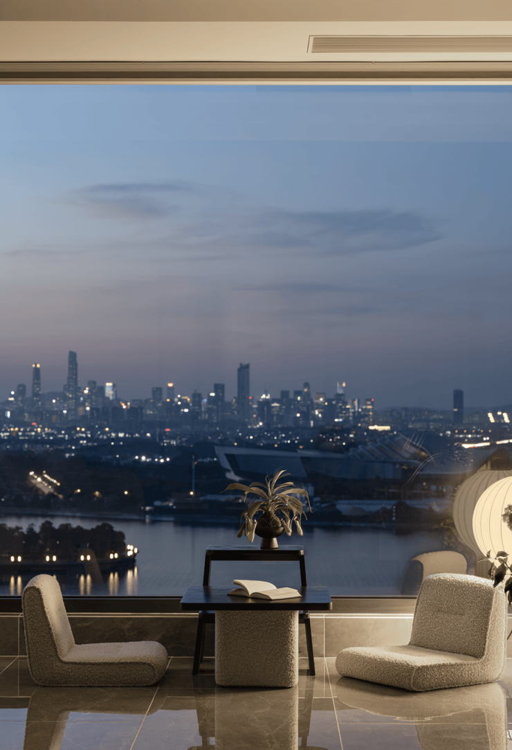 约10米南向巨幕面宽,配上270°转角全景主卧,把整个黄浦江和复兴岛都变成了家的背景。