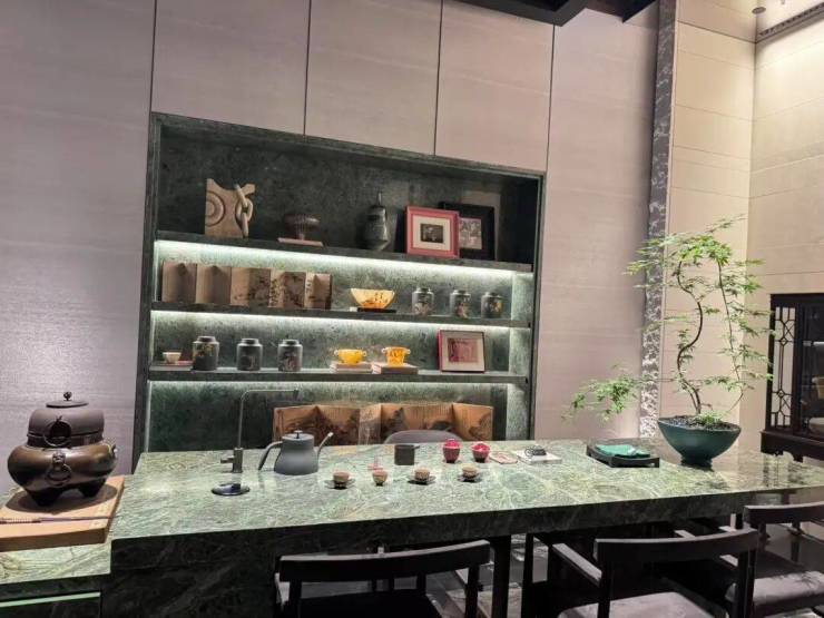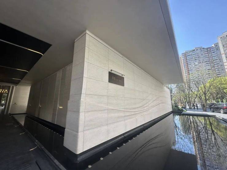 稍微走近一点, 就能看到采用了大量的弧形元素和石材材料! 石材的质感本身就厚重,在上面叠加类似海浪的线条弱化了厚重感,反而显得轻盈!