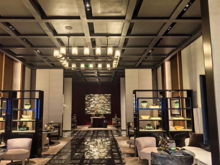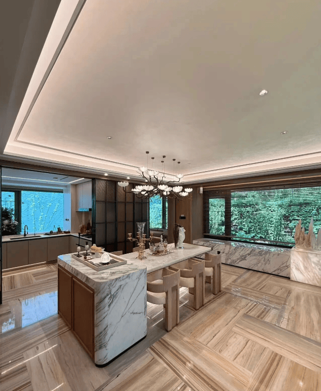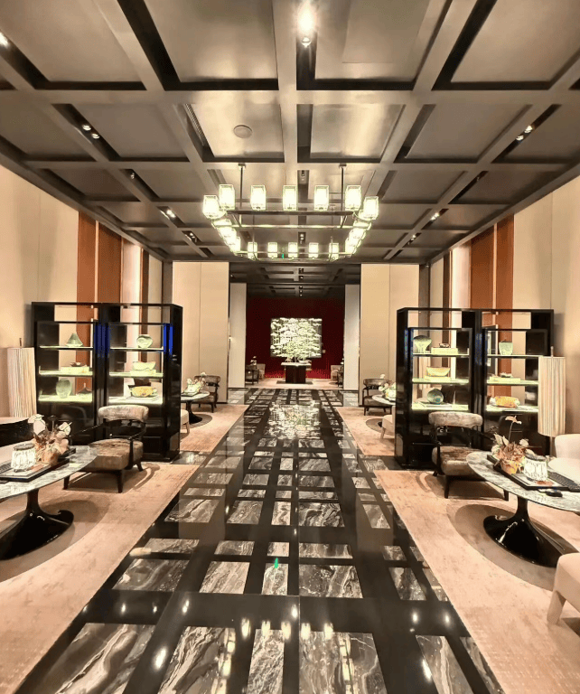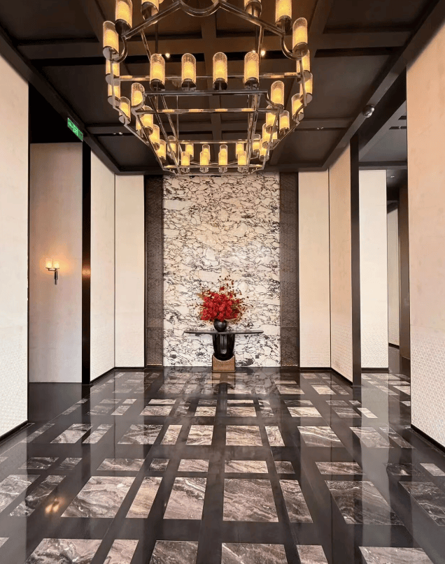 材料 选用 意大利石材,BVLGARI HOTEL大理石,铝型材塑型红, 四层金属网格 墙面以及 梧桐叶金属屏风 等! 打造独属老静安的记忆符号,高奢定制,市区豪宅调性拿捏!