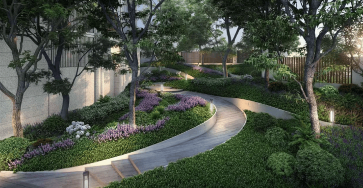 通过多级抬高的坡地,堆坡造园,呈现类似旧金山九曲花街的观感,每一段起伏都是精心设计的场景体验!