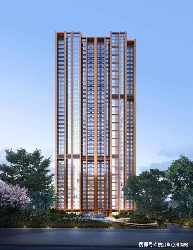 龙盛·湾上住宅建筑采用塔冠的设计,与区域内天际线交相呼应;立面选用低饱和度的橙色和深灰色作为主基调色,使用铝板结合深灰色门窗线条,形成简约高奢的风格,能够经历时间考验,发自本质之美。