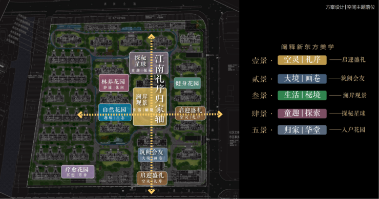 以江南人文精神为源点,打造两轴一环五进空间,江南礼序归家轴串联启迎盛礼、筑阙会友、归家华堂等5重礼制,尊崇归家;健康运动轴以24小时跑道为社区活力生活环,串联儿童乐园、长者康养、疗愈花园等10大生活场景,营造全龄全时的江南诗意生活。
