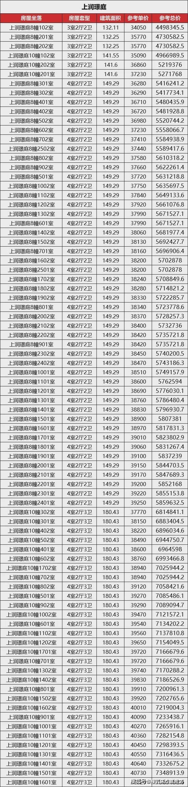 一房一价表如下
