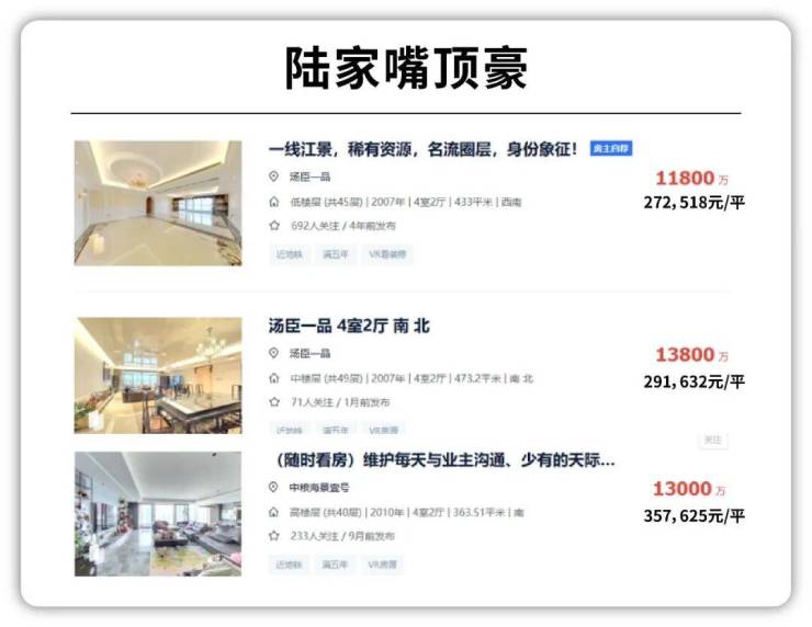 上海本土顶豪中,汤臣一品(陆家嘴)高区江景二手房27-30万/㎡,中粮海景壹号一线江景20-35万/㎡,绿城黄浦湾(外滩)一线江景24-33.6万/㎡。