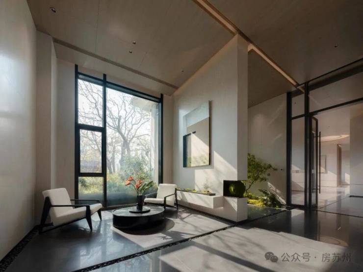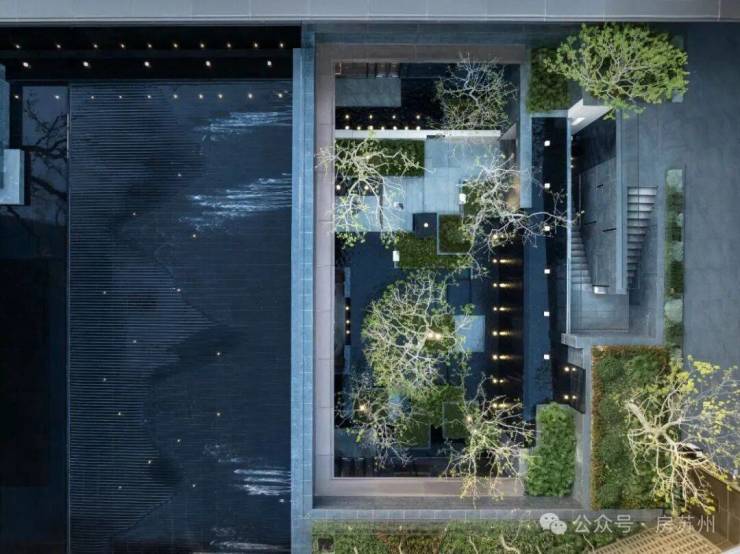 ①390㎡静心水院,静心水亭与大师建筑隔水对话,营造酒店式的宁静雅奢氛围,山水纹理的艺术水景,体现苏州在地山水画卷。