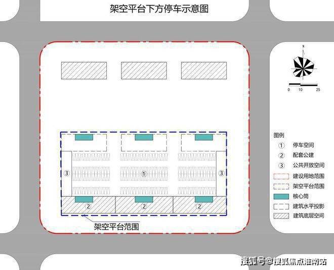 架空车库位于小区东面和南面楼幢的连接区域,整体呈现出三大块空间布局,其出入动线设置在小区东面。