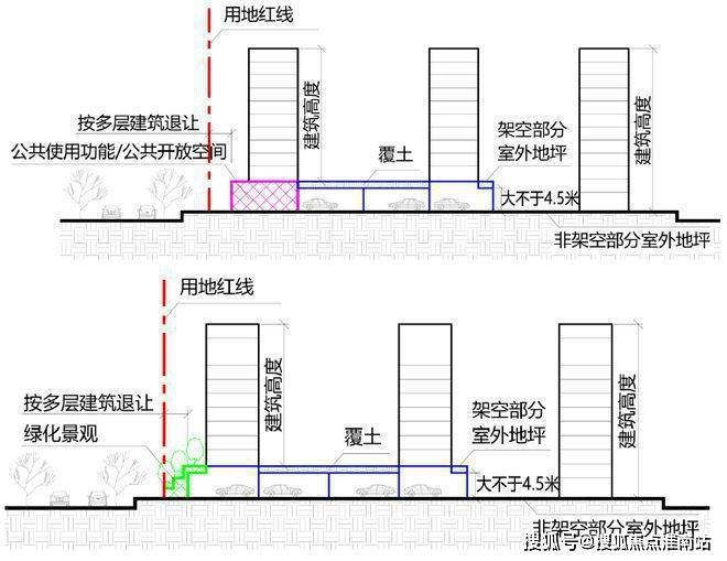 居住用地内位于底层架空平台下方的停车空间,结构层高应不大于4.5米,以平台(含覆土)面层作为室外地坪计算平台以上的建筑基底面积、绿地面积。
