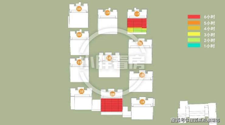冬季:2#采光优异几乎不存在遮挡。11#低层受遮挡。就具体遮挡时间而言,11#除早晨和傍晚外其余时间段均受遮挡。
