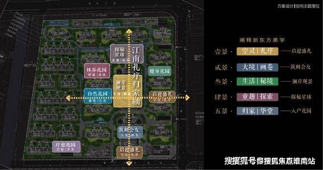 以江南人文精神为源点,打造两轴一环五进空间,江南礼序归家轴串联启迎盛礼、筑阙会友、归家华堂等5重礼制,尊崇归家;健康运动轴以24小时跑道为社区活力生活环,串联儿童乐园、长者康养、疗愈花园等10大生活场景,营造全龄全时的江南诗意生活