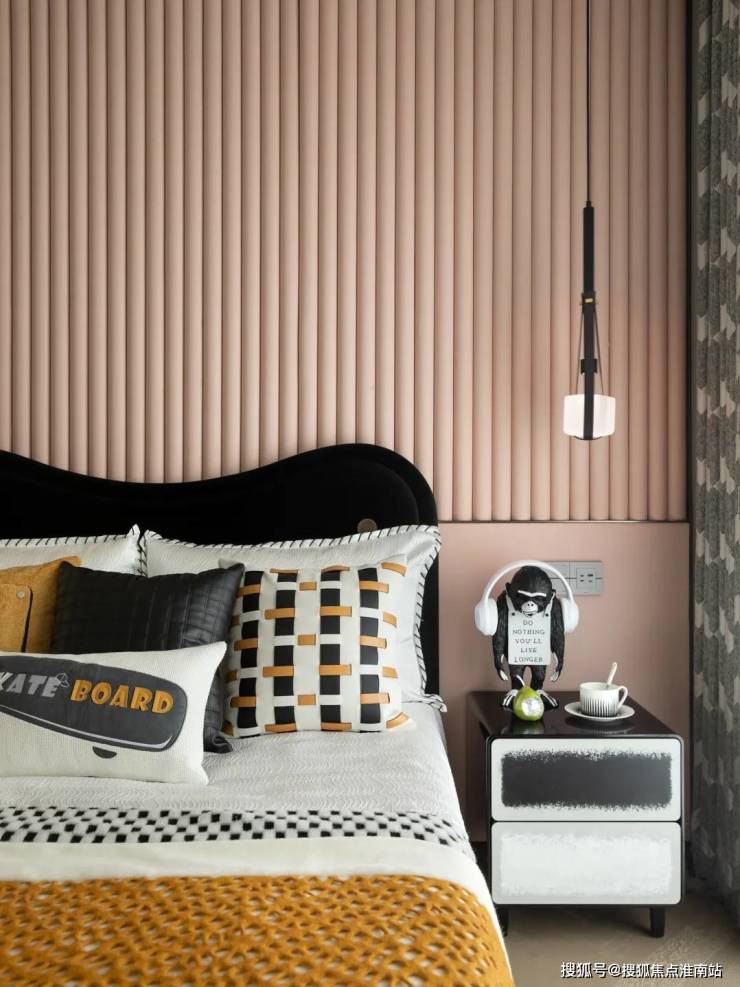 118㎡户型,客餐厅、厨房通过 开放式布局,为业主提供开阔、通透的居住体验。 沙发曲线自然灵动,与规整的柜体相互映衬;主卧氛围静谧,次卧温馨柔和;阳台作为“猫主子”的专属领地, 充分满足猫咪“攀爬-跳跃-躲藏-观察”的生活习性需求。