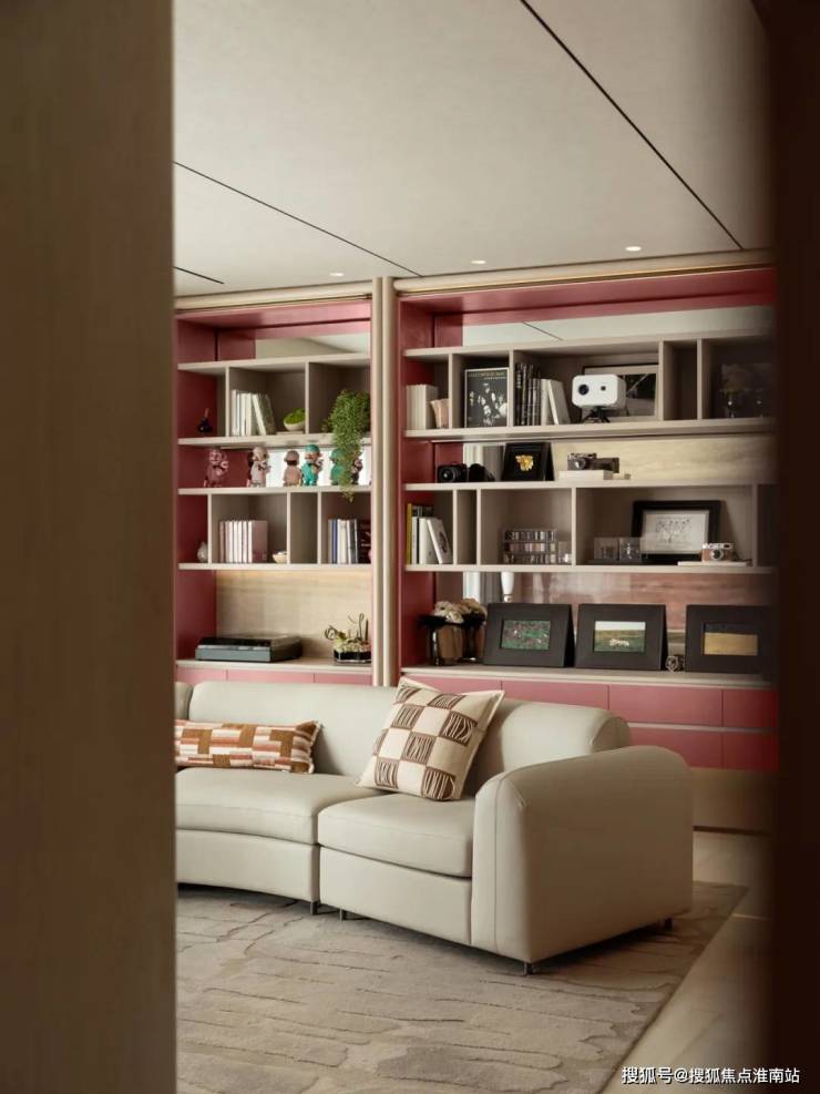 143㎡户型,客厅的吊顶设计与金属收边,以现代手法平衡了石材的厚重感, 黄玉电视背景墙勾勒自然纹理,整墙书柜兼顾收纳与艺术陈列。主卧以 米色与棕色为主调,米色护墙板通过竖向线条设计延伸视觉高度;儿童房以 柔和粉色为主调,整体布局兼顾多种功能,打造实用又充满欢乐的成长空间。