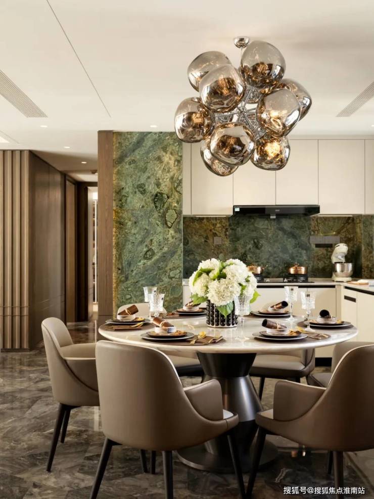 188㎡户型,客餐厅一体化设计, 威尼斯棕大理石拼花地面延伸视觉张力;厨房区域的 绿宝石纹理墙面与大理石橱柜相互映衬。男孩房以 灰蓝色为主色调,墙面的 竖线条设计,赋予空间疏朗的气质;女孩房 浅粉色的竖条纹背景墙,温馨浪漫。