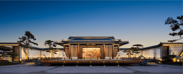 入境观唐,尺度威仪的唐风大门,面宽约40米,高约9.6米,屋顶采用“重檐歇山顶”形式,彰显中式门第尊崇之礼。