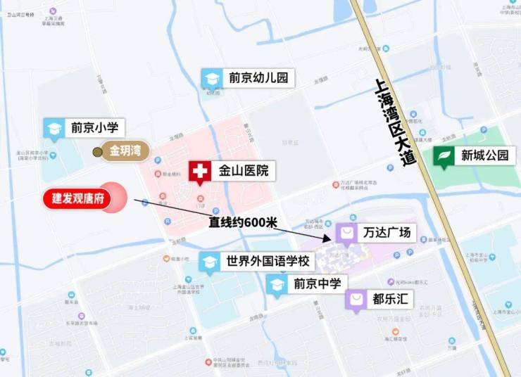 以建发观唐府为核心,周边直线约600米范围内,汇聚着金山如今更核心的资源: