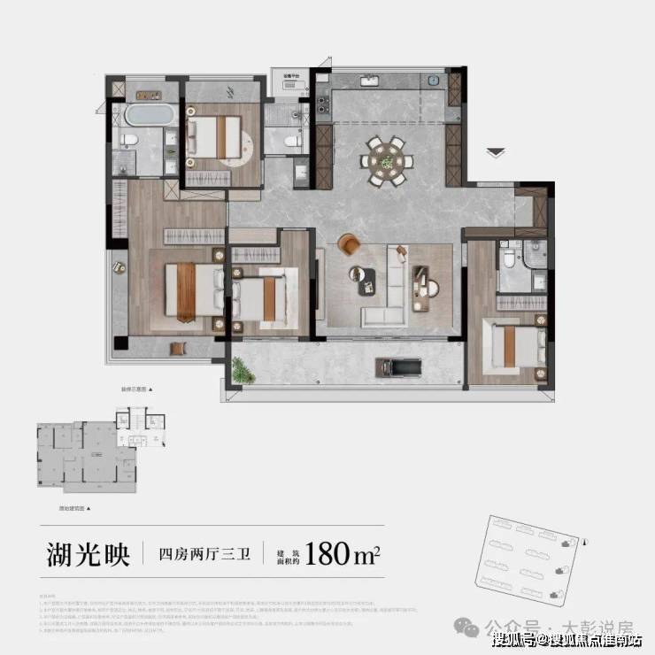 主卧270°飘窗设计,湖景采光、视野极佳,南向内卫设计,新颖实用;