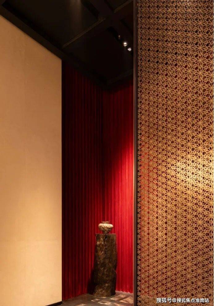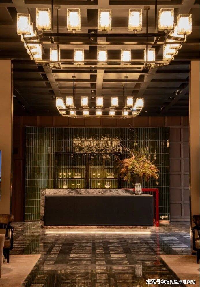 又如拾玖间地下会所水吧背景墙的景德镇冰裂瓷,近千度窑火烧制,诉说时间的答案;会所中大量软包皮革,采用雕花皮革纹,道道工序,样样精心,结合当代摩登美学,营造值得经久回味的本色。