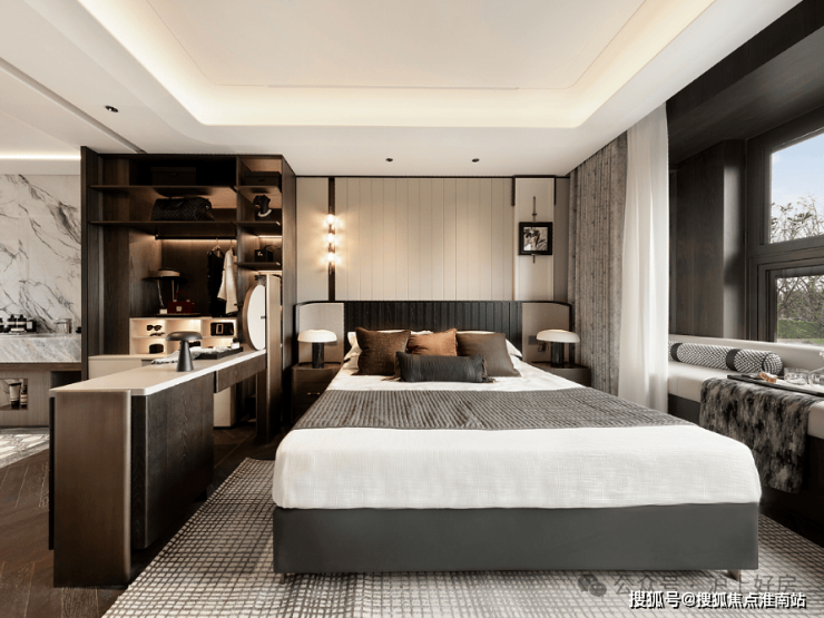 南北通透的主卧套房,则是另一种“极致”,将主卧小家化的功能性得到了充分释放,但同时酒店式的设计则为私密空间的舒适度与空间仪式感给予了最佳的氛围;更阔绰的飘窗设计,不仅让室内空间更拓展,视野更开阔,还能承载更多功能,坐在飘窗上品茗、读书,享受午后阳光的轻抚,听耳边小鸟的低鸣,生活就是这样惬意。