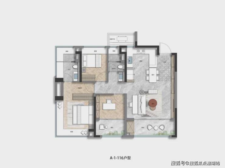 建面约116㎡3房2卫动静分离的户型,几乎是这个市场上最好的户型。