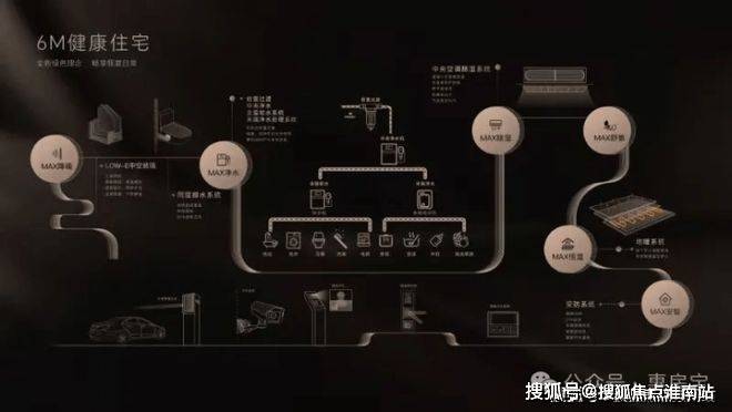 全屋配置6M健康智能住宅系统。这个智能系统系统涵盖降噪、净水、除湿、恒温、安智等多方面。