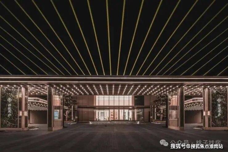 墨绿色的奢石景墙沿着两边对称排开,嵌上了粗细有致的金属线条做分割,底部是人字形纹路的铝板做拼接,到了夜晚,还能看到头顶的「满目星光」。