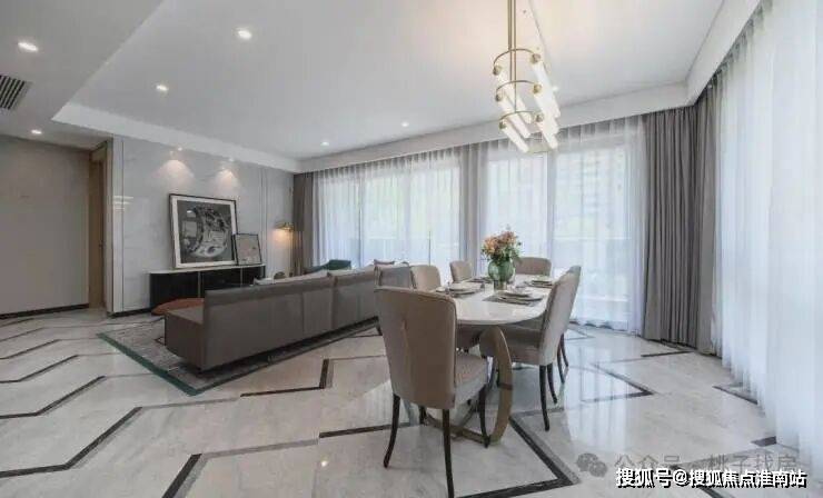 下叠四房两厅三卫的设计。一层南向整体面宽约10.8米,餐客厅一体,连通约7.2米的长阳台,大横厅与落地窗的搭配,增加了室内空间与庭院的互动。一层独立入户,南北通透客餐厅一体的起居空间,足以容纳一个大家庭的节日聚餐或是一场精致的下午茶party。