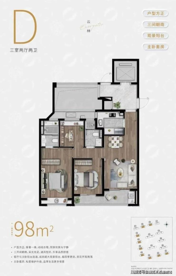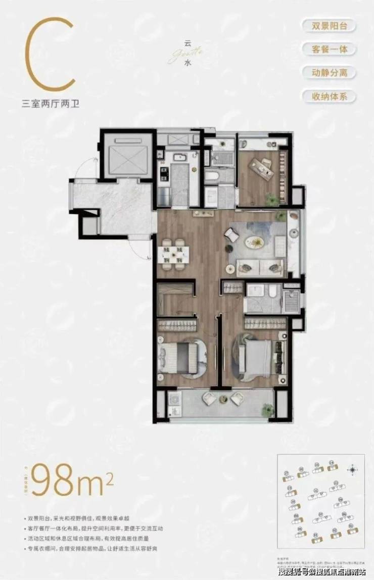 实用性方面,户型3房3卫、南向双套房的设计,可以保证每个家庭成员都能拥有更具私密性的居住空间。