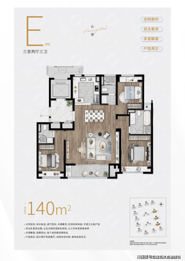 建面约140㎡3房3卫户型,三开间朝南+大横厅的设计,整个南向采光面相当宽绰。