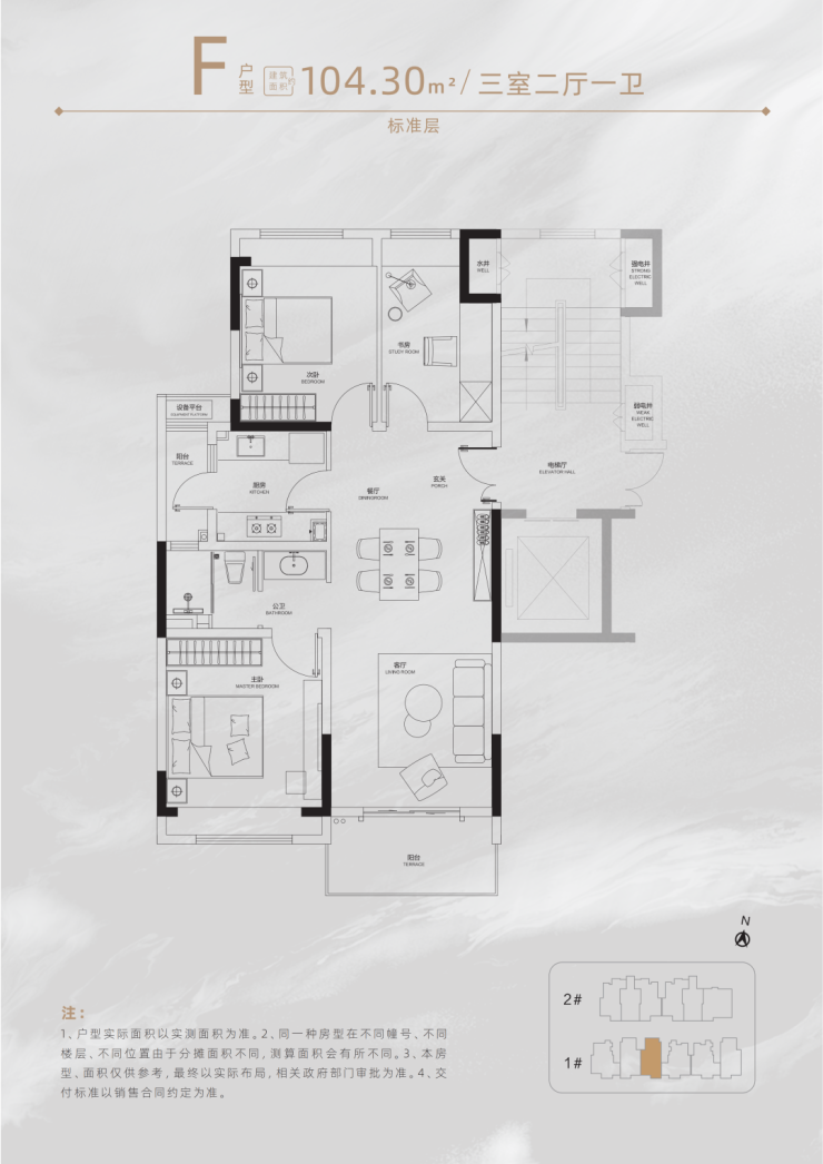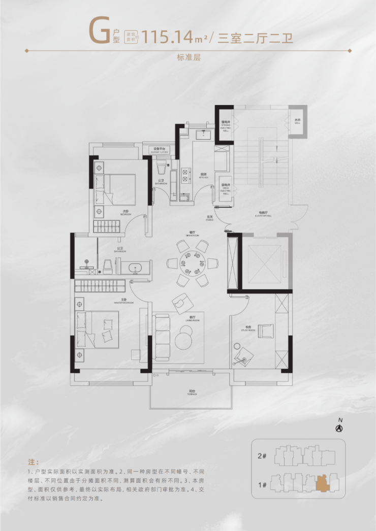 三居:建面约104.3–115.4㎡(3室2厅1卫或2卫)
