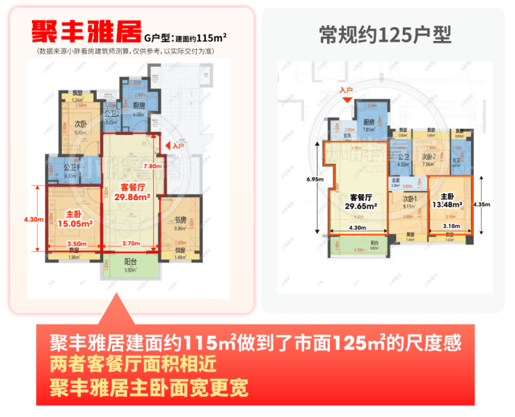 实地参观能明显感受到客餐厅、卧室的空间感比同级新房更开阔,数据对比更能印证这一优势:以建面约115㎡为例,其空间尺度已接近市面125㎡户型水准。