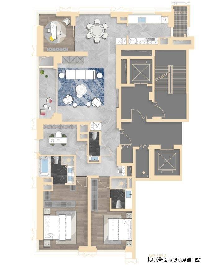 193、237㎡为类一梯一户设计,拥独立门厅;建面约302㎡标配两梯一户 。