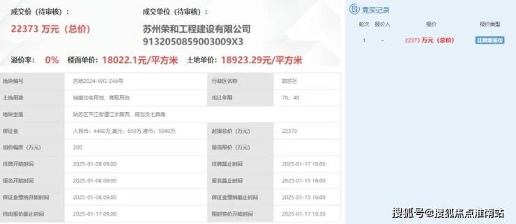 该地块成交于今年1月中旬,由苏州荣和工程建设拿下,成交楼面价18022元/㎡,地块容积率约1.05!