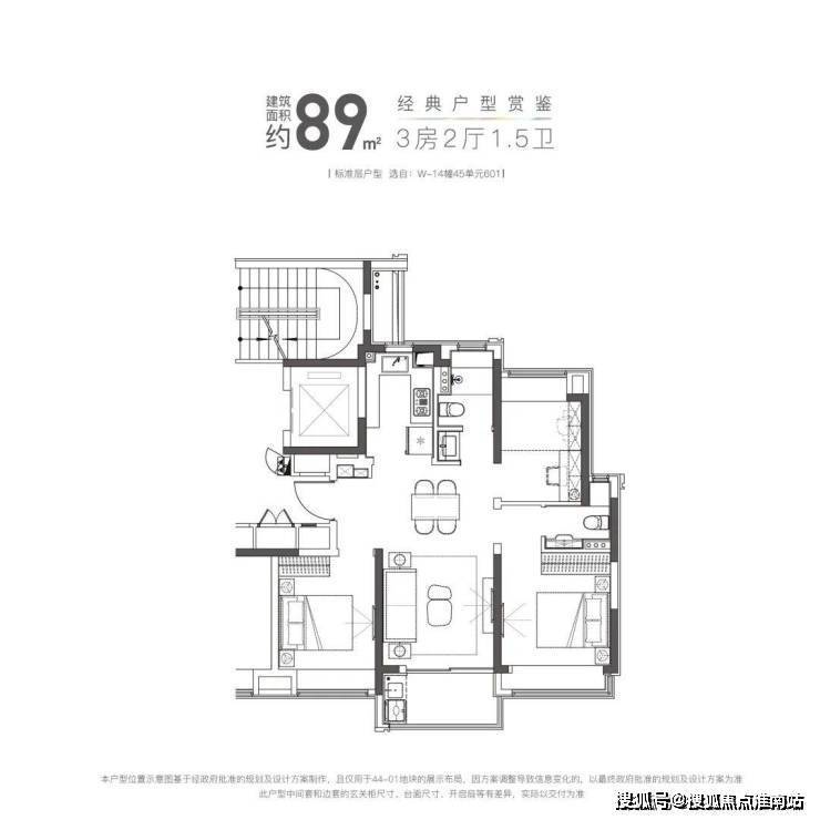 建面约89㎡3房1.5卫,三开间朝南,每个房间都有飘窗,不管是采光度、实用性还是视野都非常不错。