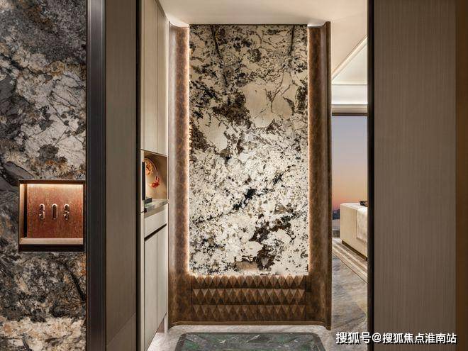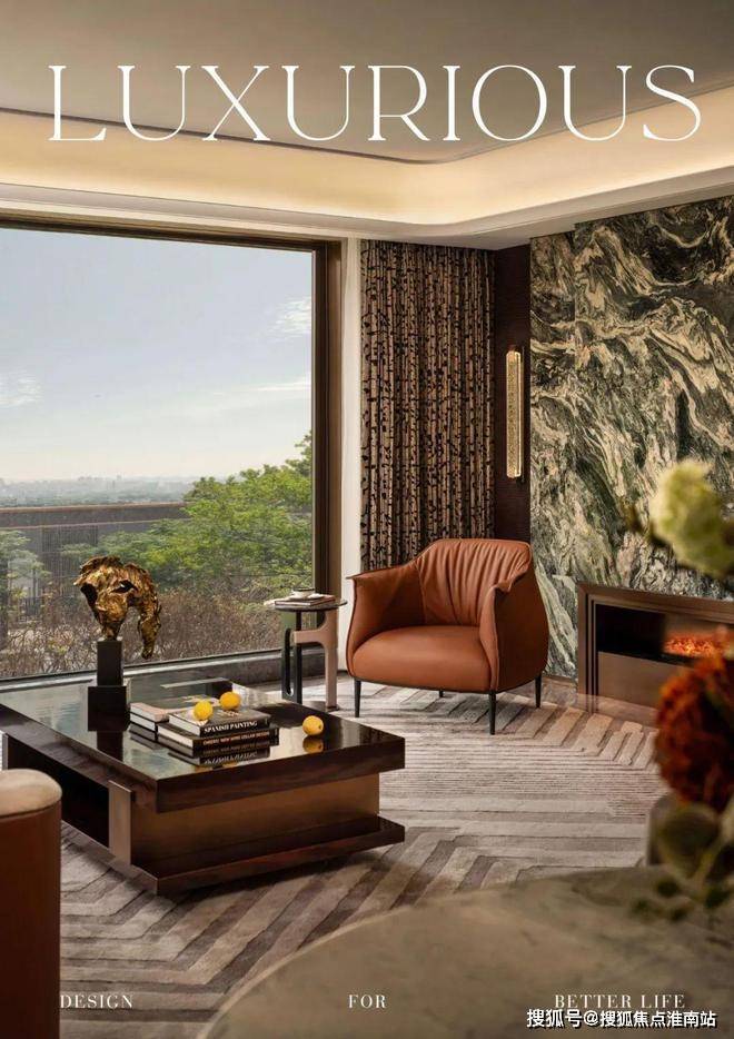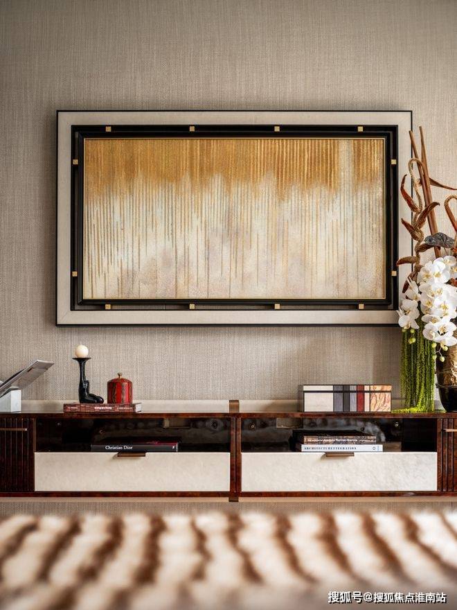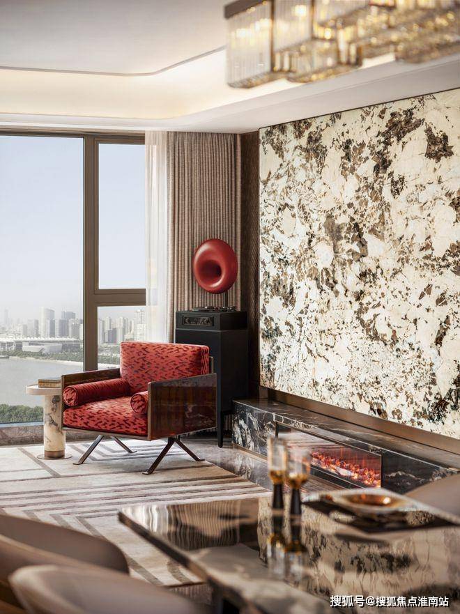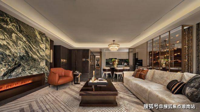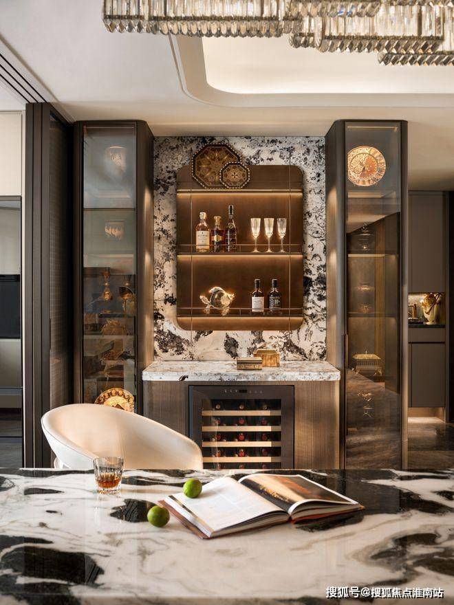 窗外沙湖波光粼粼,暖棕柜体与酒柜石材自然过渡,在空间里雅奢交融。