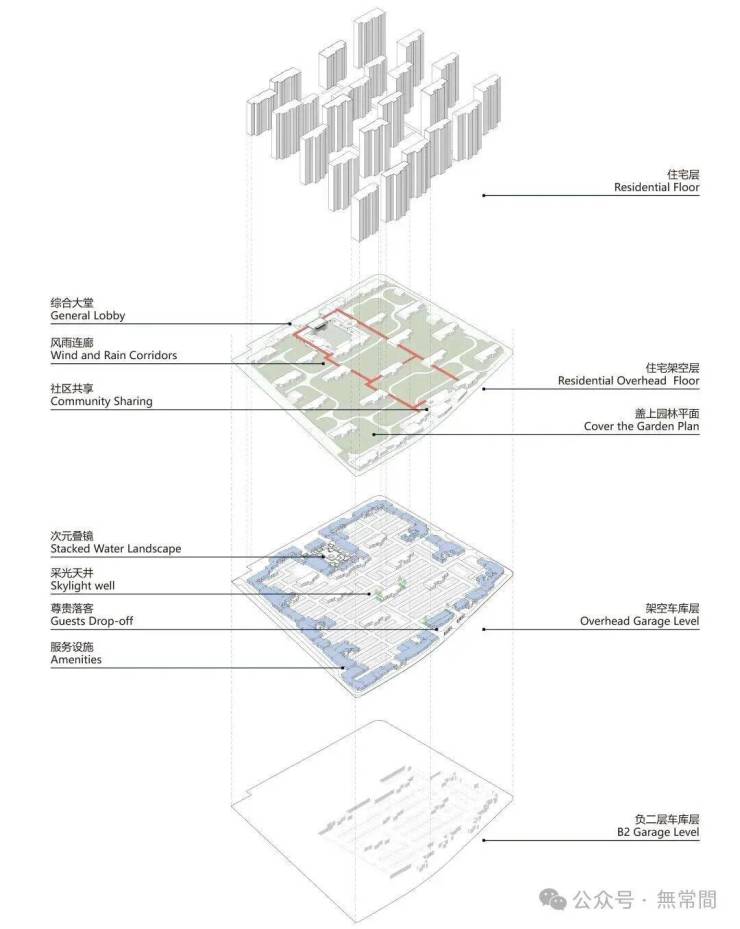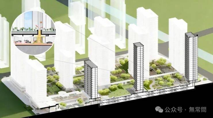 为彻底消融城市与社区的界限,项目以“超级底盘”重构社区基座。通过抬高地库、整合车站与商业配套,将地下空间转化为多功能垂直枢纽。