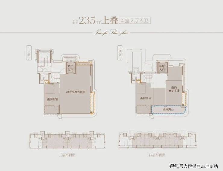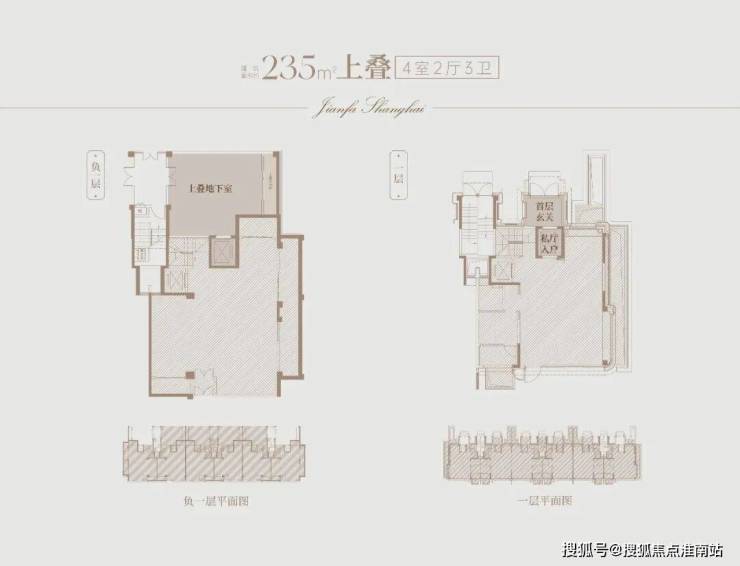 建面约235㎡上叠,则为三代同堂的家庭提供了解决方案。北向首层私享建面约25㎡的入户花园;上叠三层以无界厅堂为核心,约10.4米开间让光线无遮挡漫入;上叠四层三间卧室均朝南,实现全明采光;与市场常规上叠不同,建发海宸上叠拥有建面约80㎡地下空间(双层)与建面约50㎡私家阁楼,真正实现“空间超越面积”的价值升华。