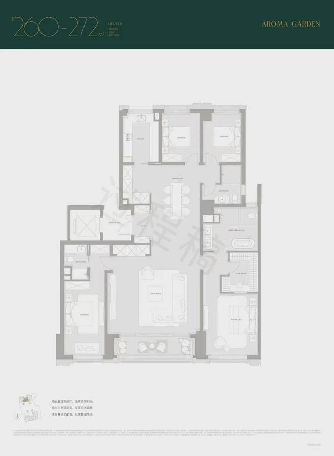 建面约260/272㎡,南向双套房,尤其主卧是豪华套房,带独立衣帽间,卫浴间含双台盆+淋浴+浴缸+马桶四件套。