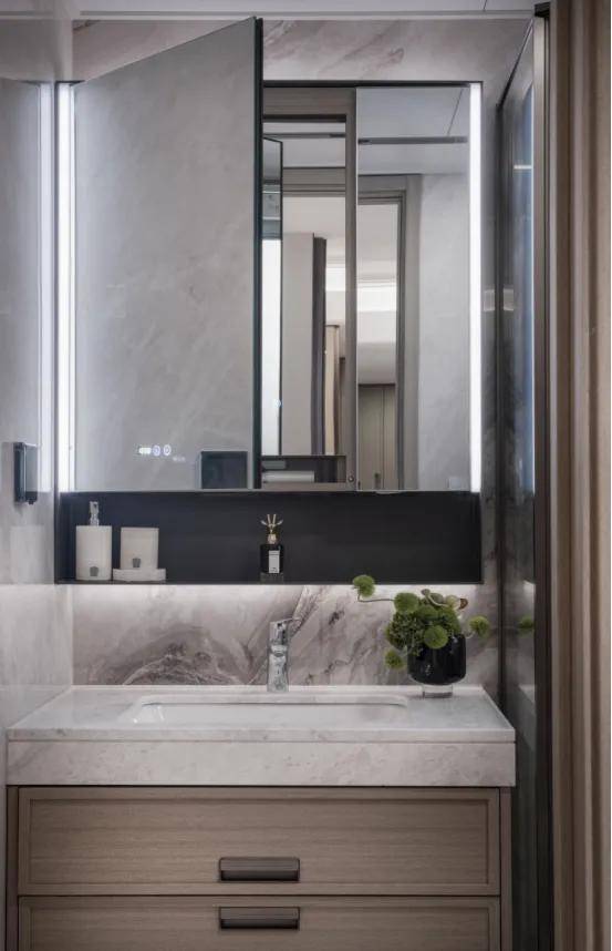 背后主墙面采用岩板设计,经久耐用,内部还收纳细节还预留4孔电源,电动牙刷、卷发棒等吹风机收纳孔、洗脸巾抽取孔。